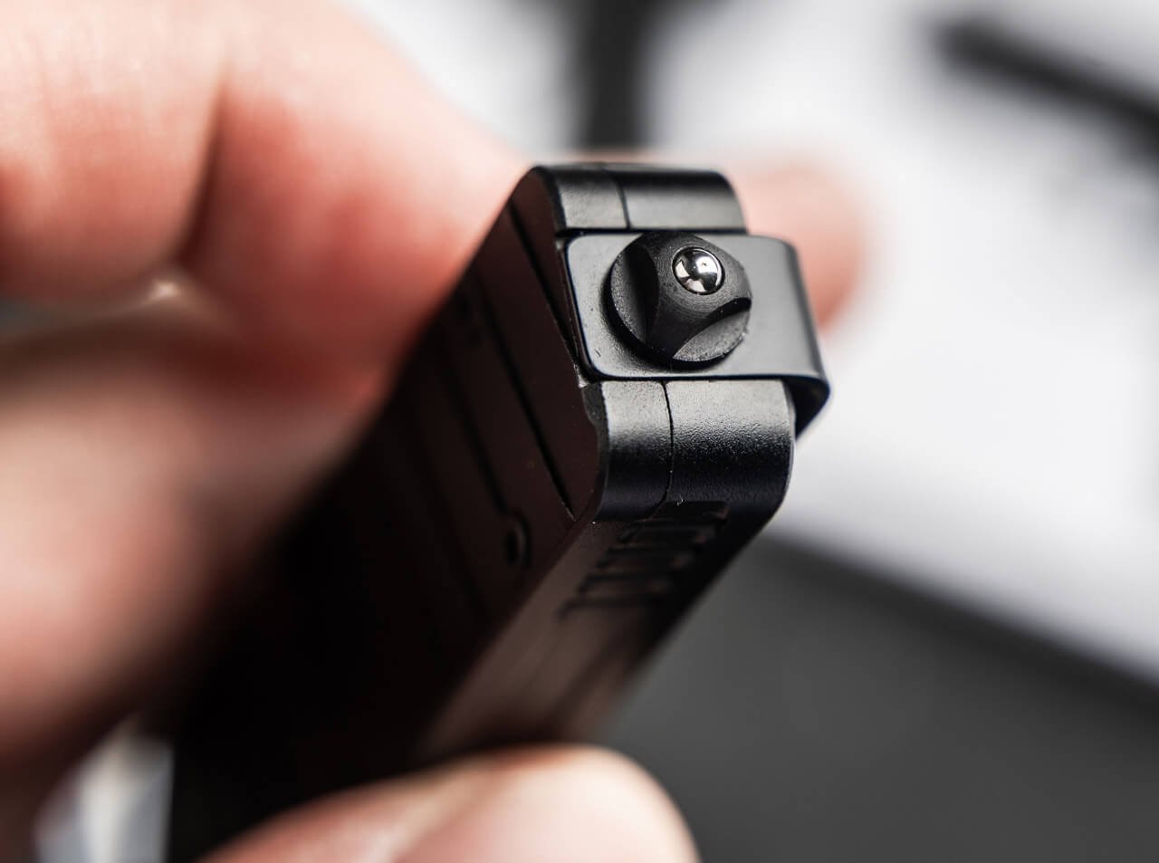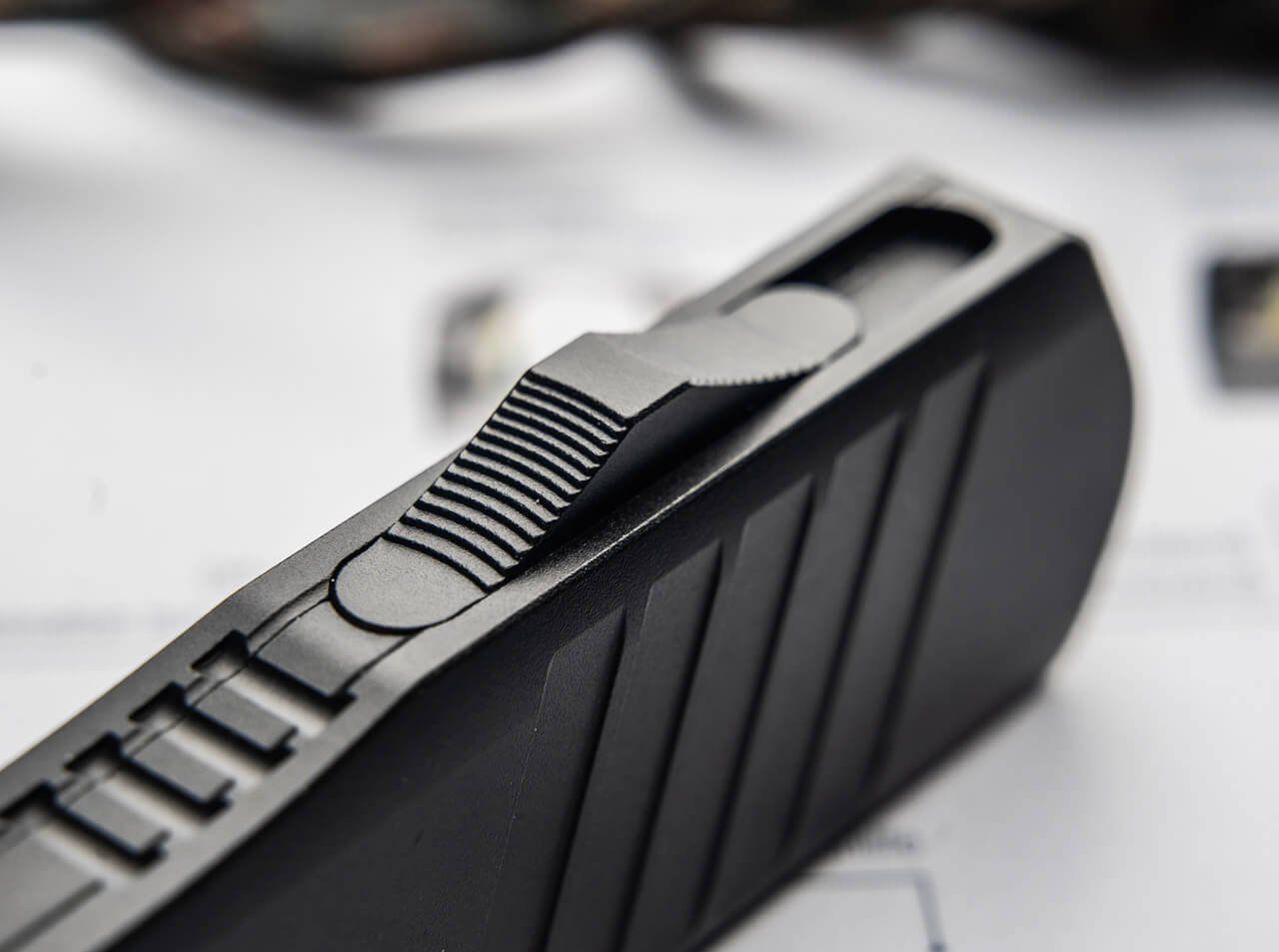 Автоматический слайдер безопасен в эксплуатации и при этом не мешает управлению ножом. Для улучшенного хвата алюминиевые накладки рукояти оснащены крупными продольными канавками — их шаг и угол соответствуют насечкам на затворе пистолетов HK. Мощная переставляемая клипса (левая/правая сторона) обеспечивает удобное и безопасное ношение в повседневных и служебных условиях.