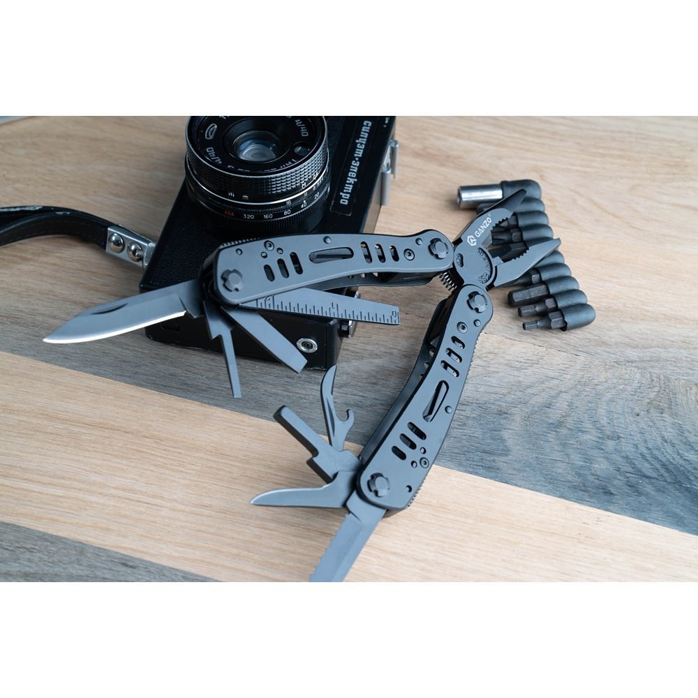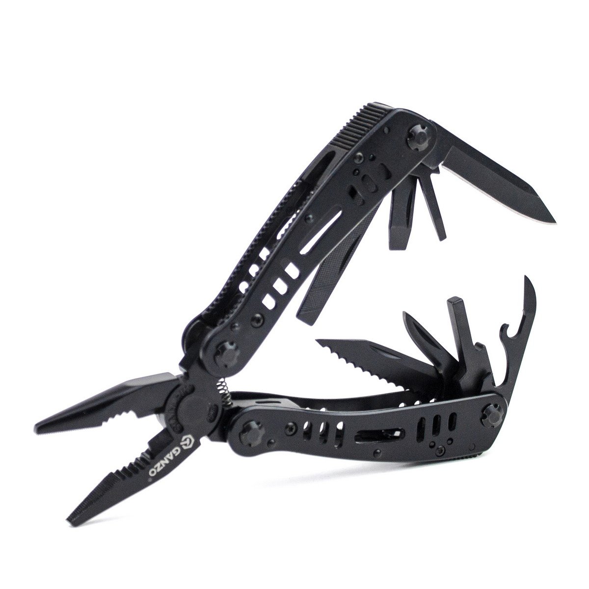 Мультитул Ganzo G103 цілком виправдовує звання «кишеньковою майстерні». При вазі 248 грам і довжиною в складеному вигляді всього 10,5 см, він має 22 різними функціями. Цей інструмент допоможе вам усунути несправності велосипеда, туристичного спорядження, спорядження мисливця або рибалки. Так і в домашньому побуті він знадобиться не один раз. Одне з основних переваг такого мультитула — наявність повноцінних плоскогубців з потужними пружними губками, вбудованими кусачки для дроту і ребристим захопленням для предметів круглої форми. Крім того, в порожніх зсередини рукоятках мультитула розміщуються відкривачка для пляшок, дві плоскі і хрестоподібна викрутка, шило (його можна використовувати в якості маленького ножа), лінійка, на зворотному боці якої — напилок, два клинка (гладкий і з серрейторной заточкою). Також є тримач для біт з квадратним перетином. Самі ж біти додаються в окремому органайзері: 8 змінних насадок і перехідник.