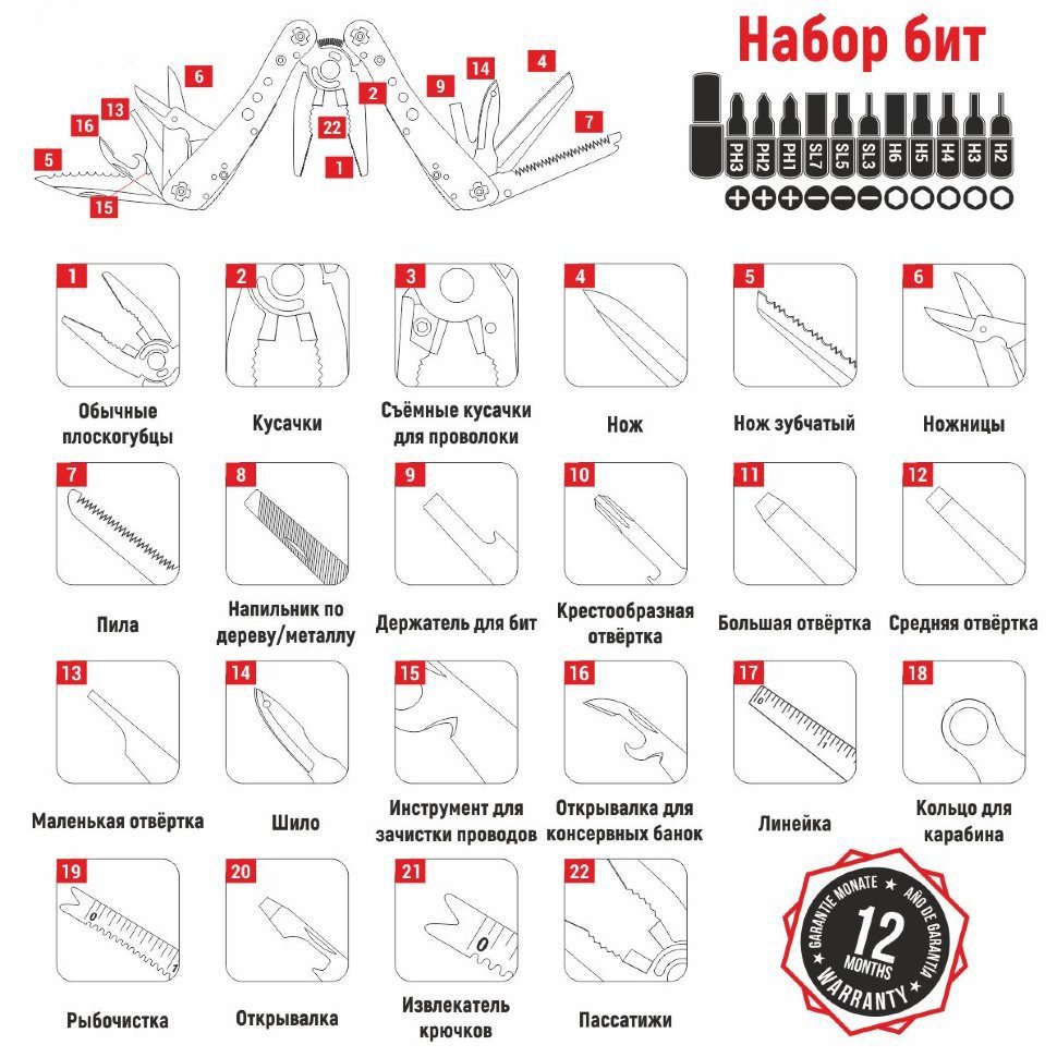 - Количество функций: ножі з гладкою і серрейторною заточкою, пила, відкривачка для консервів, ножиці, шило, дві невеликі плоскі викрутки