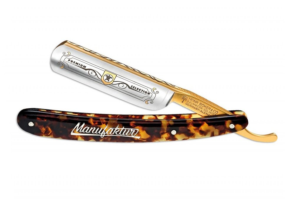 Производство опасных бритв компанией Boker началось с момента основания «Heinr. Boker & Co» в Золингене в 1869 году. С самых первых дней большое внимание уделялось качеству материалов и изготавливаемой продукции, что принесло бритвам Straight Razor успех и всемирную известность. После окончания Второй мировой войны производство бритв было приостановлено. Сохранившийся до наших дней оригинальный каталог Boker USA 1906 года с полным ассортиментом опасных бритв представляет собой старейший документ в архиве компании. Со временем производство бритв возобновилось. Сейчас классические опасные бритвы Straight Razor изготавливаются в традиционном дизайне, но с использованием новейших технологий и материалов. Рукоять бритвы Boker Tortoiseshell выполнена из специального очищенного пластика — целлулоида и представляет собой имитацию панциря черепахи, которая гармонично сочетается с позолоченными элементами клинка, изготовленного из углеродистой стали.