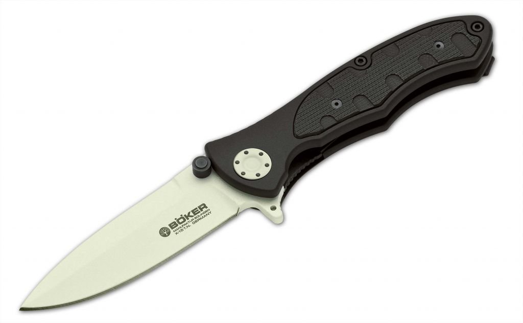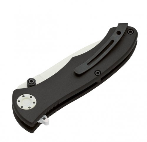 Линейка ножей Boker с обозначением Illumination в названии имеют одну интересную особенность. В зависимости от модели, на некоторые части ножей нанесено специальное запатентованное покрытие, аккумулирующее дневной свет и светящееся в темноте. Помимо декоративной функции покрытие имеет и сугубо практическое применение - нож не потеряется в темноте. За основу взята модель Turbine. Клинок также изготовлен из стали X-15T.N. Обработка клинка – пескоструйная. Рукоятка ножа изготовлена из высокопрочного алюминиевого сплава AlMgSi1. Глубокие под пальцевые выемки и вставка из текстолита G-10 с глубокой насечкой (у оригинальной модели вставка была из дерева) способствуют очень уверенному удержанию ножа в самых экстремальных условиях. Специальный выступ в основании клинка позволяет моментально открыть нож и работает как гарда когда нож уже открыт. Переставляется в два положения клипса позволяет носить нож в кармане остриёом клинка вверх или вниз. Для экстренных случаев в рукояти ножа установлен стеклобой.