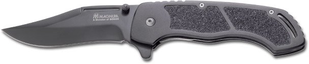 Небольшой складной нож Black Marine демонстрирует вороненый клинок «боуи» с выразительным желобком вдоль обуха, а также эргономичную рукоятку из нержавеющей стали с вставками, препятствующими соскальзыванию руки. На удобства ношения нож оснащен клипсой.