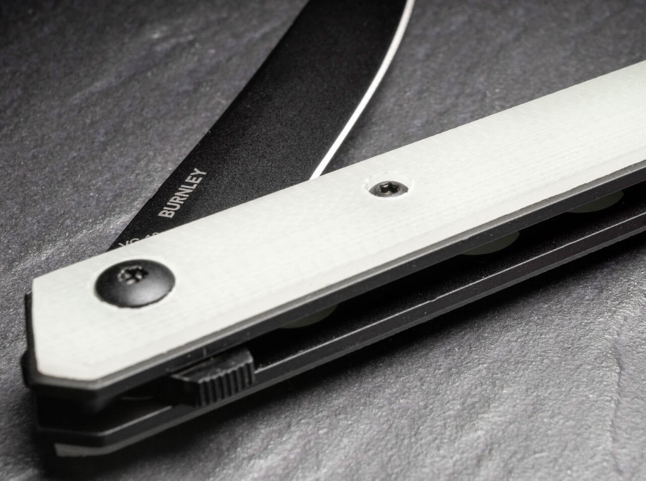 Клинок извлекается с помощью флиппера и фиксируется замком Liner Lock. Рукоять формируют стальные лайнеры и декоративные накладки из древесины, титана или G-10.