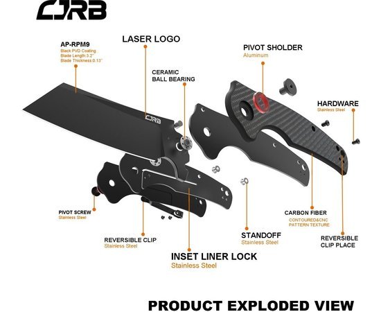 В зависимости от модификации, клинок изготавливается из высокопрочной стали D2 или порошковой AR-RPM9, которые обладают высокими показателями износостойкости, а также способностью сохранять режущую кромку острой длительное время. Клинок имеет высокие спуски практически от самого обуха и гравировку с названием компании.