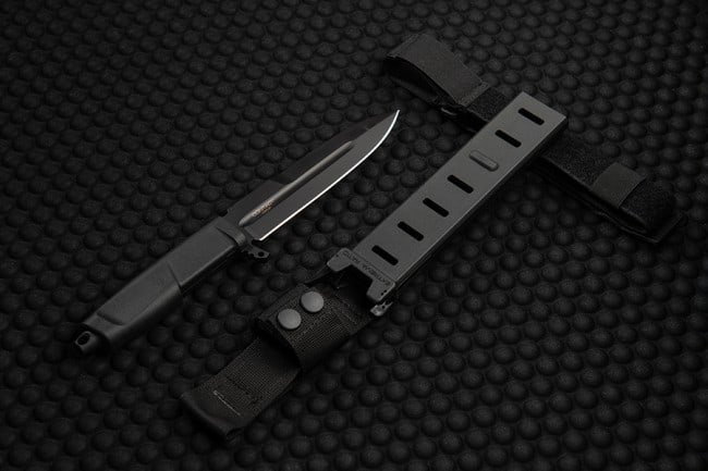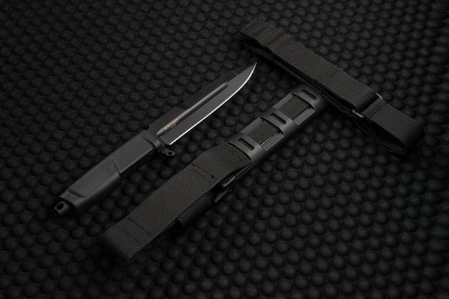 Чехол минималистичный, большая часть ткани была убрана, а основная оболочка изготовлена с помощью литья под давкой из удароустойчивого нейлона. Чтобы вытянуть лезвие, достаточно будет нажать на спусковой крюк, таким образом освободится предохранитель, который надежно удерживает нож в ножнах. В горизонтальные щели ножен добавляется система, которая фиксирует лезвие, во избежание дрожание, когда оно хранится внутри. Текстильная часть сведенная к минимуму и имеет классический двухкнопочный ремень безопасности с петлей для ремня и бедренную ленту с резиновым усилением для предотвращения обращения.