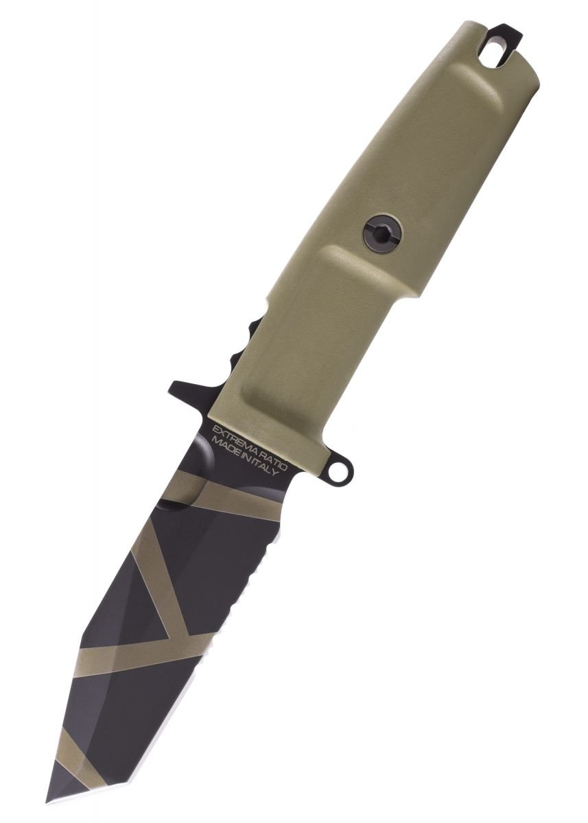 Нож с фиксированным клинком Fulcrum – новинка от известного итальянского ножевого концерна Extrema Ratio. Модель Fulcrum является многофункциональным тактическим ножом, разработанным специально для элитных подразделов итальянской армии. Дизайнеры Extrema Ratio на славу поработали и создали массивный клинок профиля танто с полусерейторной резальной кромкой. Профиль танто наделяет нож непревзойденными колющими и рубящими свойствами. Для изготовления клинка прислужила легированная австрийская сталь Böhler N690, которую закалили до 58 HRC. Для декорирования дизайнеры использовали лазерное гравирование клинка в виде маскировочных полос в цвет рукоять и выборки с обеих сторон полотна клинка. Двусторонняя гарда защитит руки во время трудной работы. За гардой, на обухе, размещенный ряд массивных насечек для упора большим пальцем. Для более деликатных задач на пяте клинка размещенный чойл.