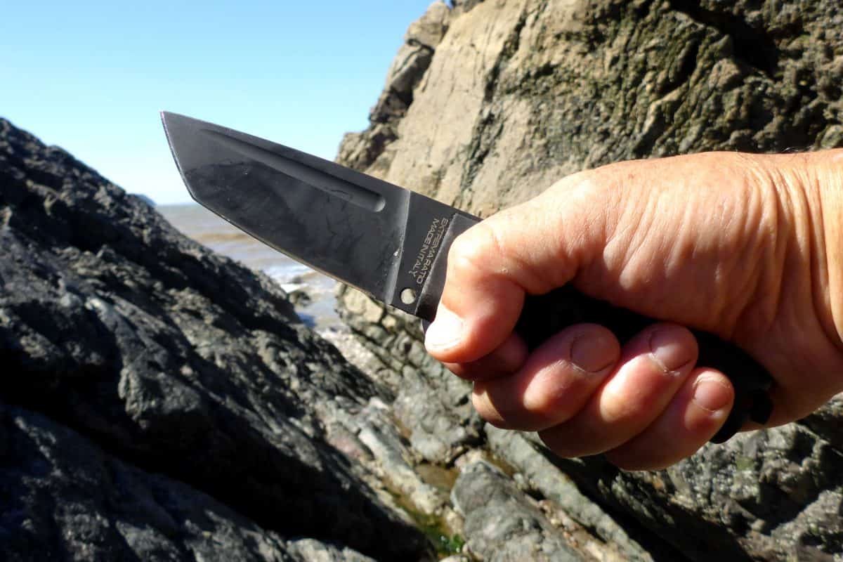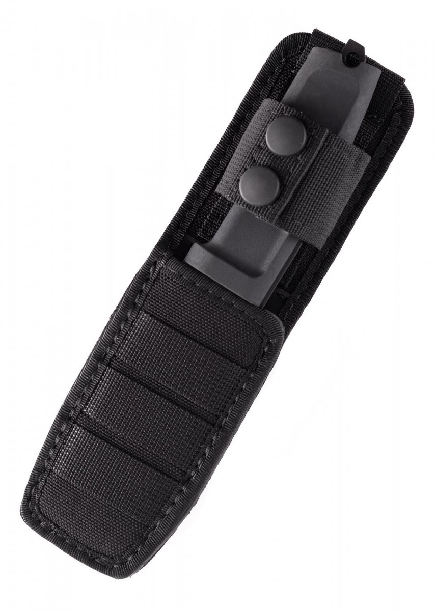 Накладки на рукоятки выполненные из термопластического материала Forprene и крепятся к общей конструкции с помощью массивного винта по центру. Forprene отличается высокой износо- и теплостойкостью, отлично поглощает вибрацию от удара, который гарантирует повышенный контроль во время использования. Эргономичная форма рукоять, разработанная по уникальной технологии ERMH (Extrema Ratio Multipurpose Handle), что базируется на принципах кинезиологии, комфортно ложится в руку. На торце размещен мощный стеклобой с отверстием под темляк. В комплекте идут функциональные ножны с креплением к ремню или снаряжению.