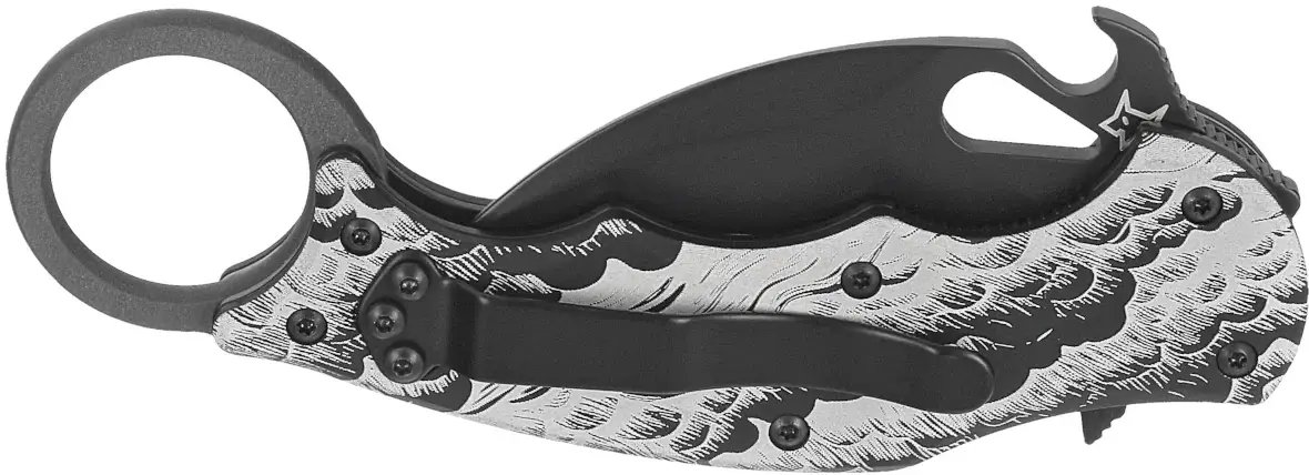 Fox Karambit - це складаний керамбіт, із виразним бойовим характером, створений для екстремальних ситуацій і водночас придатний для щоденного носіння. Клинок виготовлений зі сталі Böhler N690Co, що забезпечує чудову зносостійкість, утримання ріжучої крайки та стійкість до корозії. Ніж відкривається трьома способами - класичний фліпер, отвір у клинку (зручно навіть у рукавичках) або фірмовий гачок Emerson Wave, який автоматично відкриває лезо при вихопленні з кишені. Фіксація здійснюється перевіреним замком Liner Lock, який надійно блокує клинок у відкритому положенні.