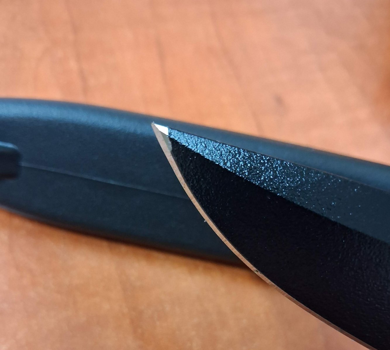 - Клинок: изготовлен из специальной легированной стали с высоким содержанием углерода, термически закалён для повышенной прочности. Чёрное матовое антикоррозийное покрытие снижает блики и защищает от ржавчины. Тип заточки — гладкий, длина лезвия — 165 мм, толщина — 5 мм.