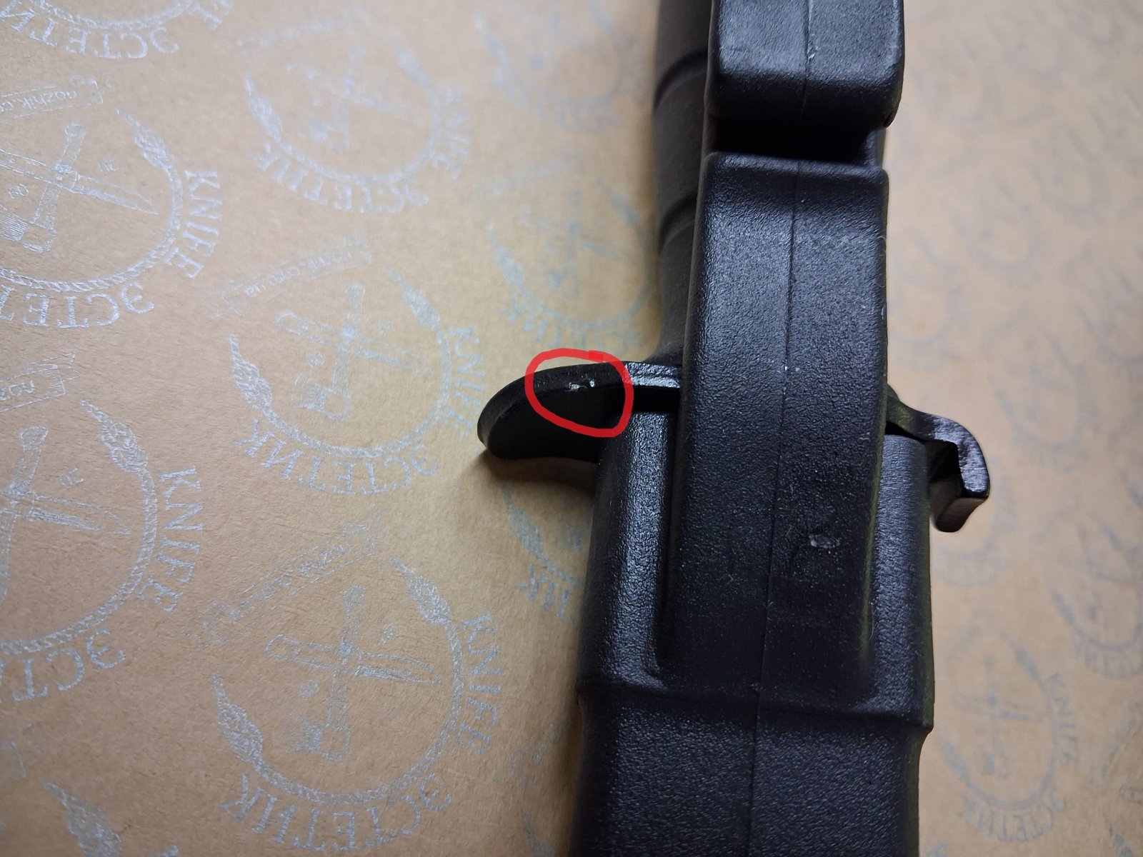 - Рукоятка: выполнена из армированного полимера, аналогичного материалу рамки пистолета Glock. Обеспечивает надёжный хват в любой погоде, устойчива к ударам и химикатам.