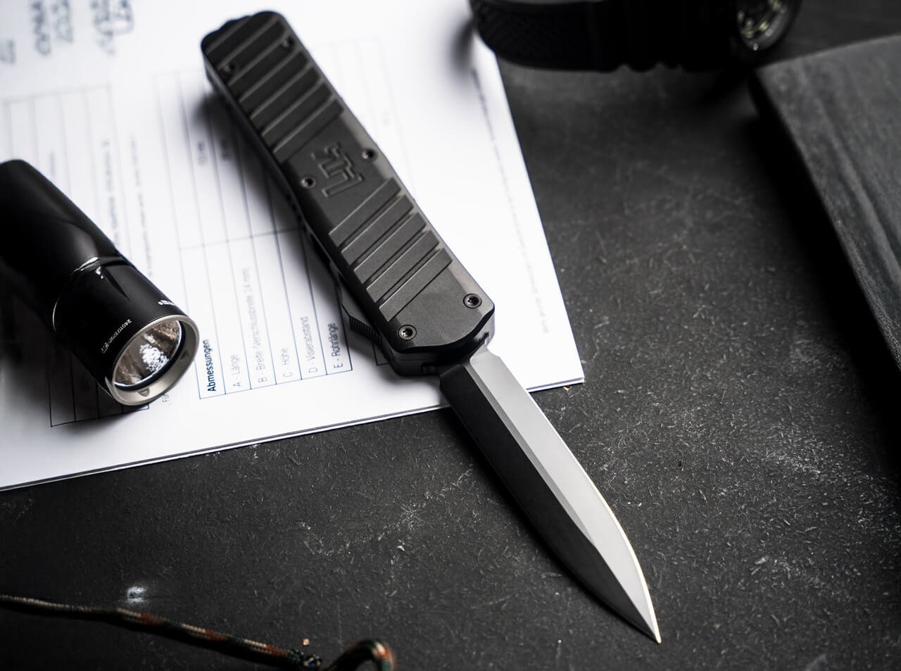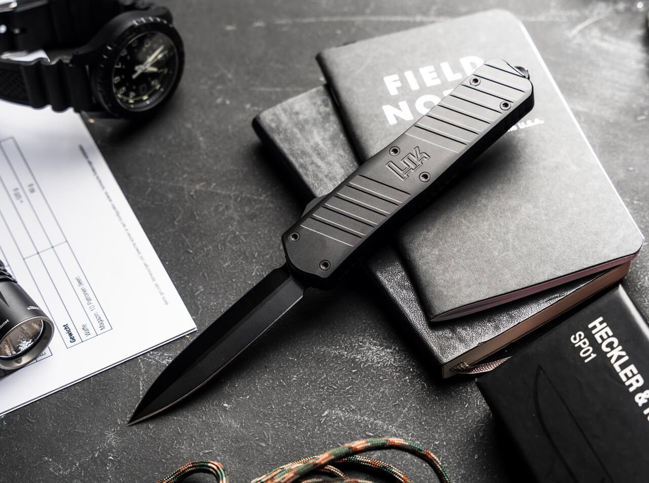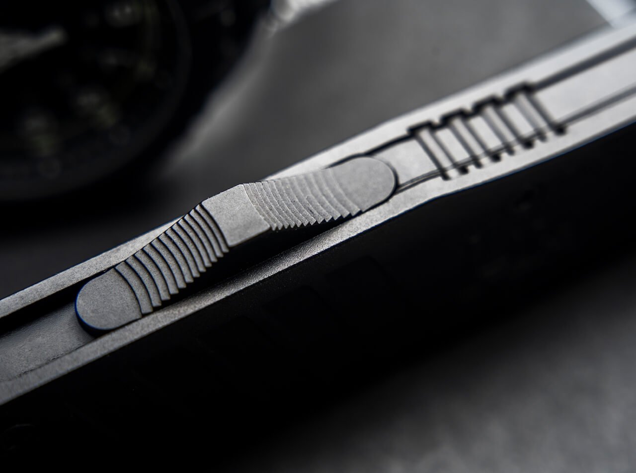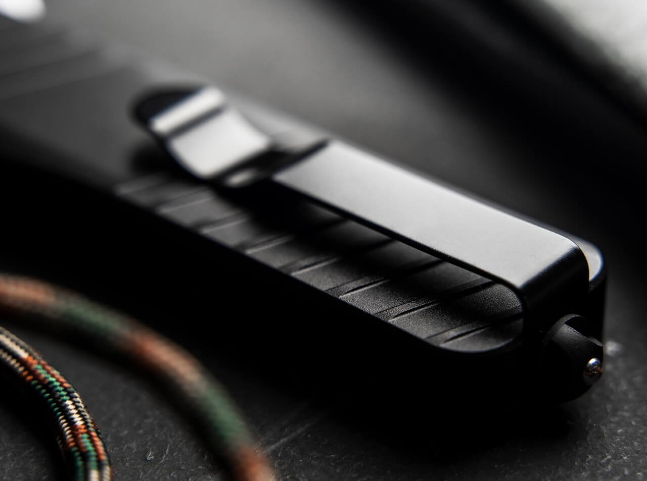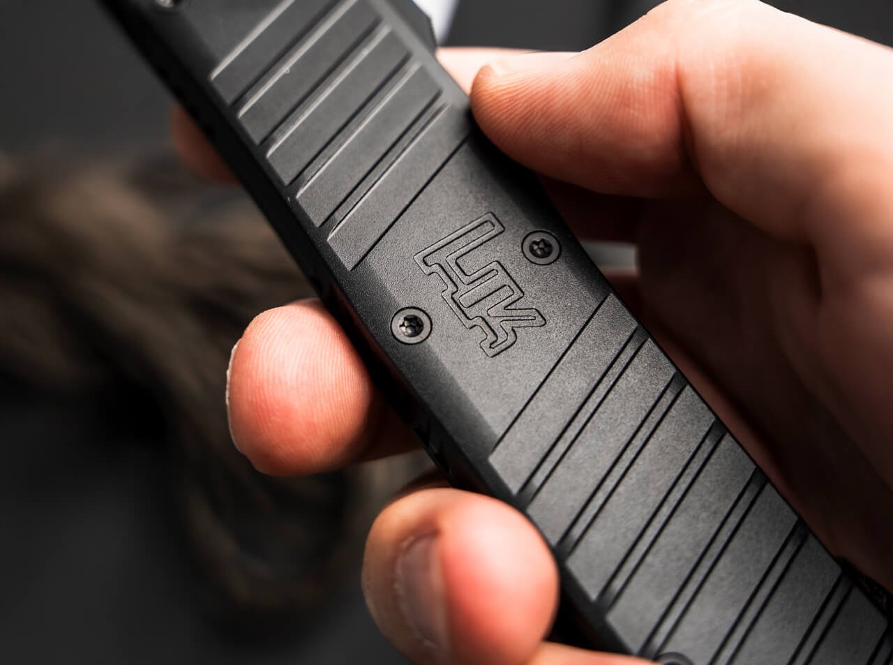 Автоматический слайдер безопасен в использовании и не мешает управлению ножом. Алюминиевые накладки рукояти оснащены крупными продольными канавками — их шаг и угол соответствуют насечкам на затворе пистолетов HK, что обеспечивает уверенный хват. Мощная переставляемая клипса (левая/правая сторона) гарантирует удобное и безопасное ношение в повседневных и служебных условиях.