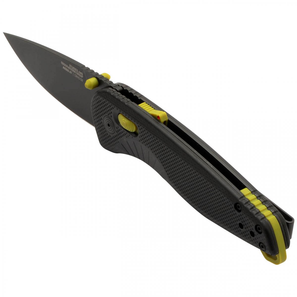 Клинок выполнен из высокоуглеродистая инструментальной стали D2, которая прошла криогенную обработку, которая обеспечивает идеальное объединение удержание кромки та долговечности с простотой обслуживание. Финишное покрытие из нитрида титана черного цвета защищает сталь от повреждений. Подпружиненный клинок вытягивается с помощью шпеника и фиксируется в рабочем положении двусторонним замком AT-XR. Конструкция замка предусматривает блокирование случайного открытия