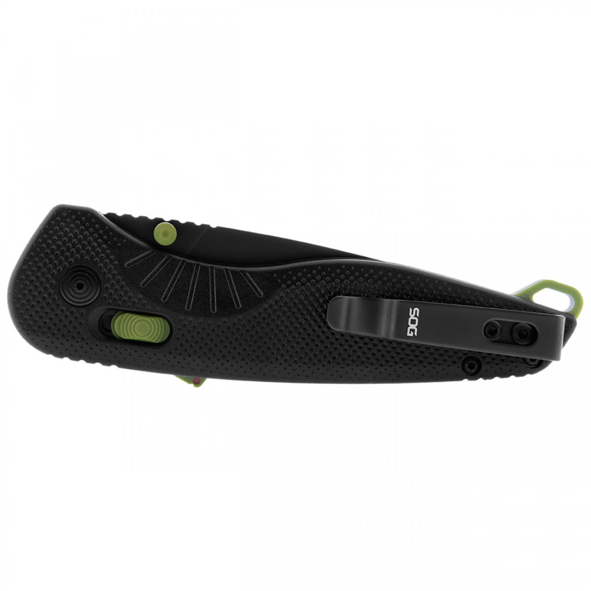Клинок выполнен из высокоуглеродистая инструментальной стали D2, которая прошла криогенную обработку, которая обеспечивает идеальное объединение удержания кромки и долговечности с простотой обслуживания. Финишное покрытие из нитрида титана черного цвета защищает сталь от повреждений. Подпружиненный клинок вытягивается с помощью шпеника и фиксируется в рабочем положении двусторонним замком AT-XR. Конструкция замка предусматривает блокирование случайного открытия