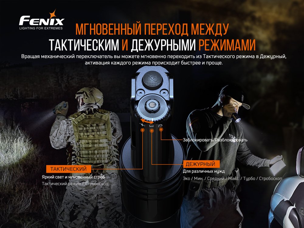 У тактичному або повсякденному режимі злегка затисніть тактичну кнопку, це дасть можливість моментально включити освітлення. Якщо відпустити кнопку, то світло вимкнеться. Якщо повністю натиснути на тактичний перемикач, включиться постійне освітлення. Для того, щоб вимкнути світло, потрібно затиснути кнопку повторно. Для перемикання режимів: в будь-якому стані моделі поверніть кнопку, щоб активувати необхідний Вам рівень. Поворот вліво дозволяє зайти в тактичний режим, а поворот вправо – заблокувати дану модель. Для входу в звичайний режим потрібно помістити перемикач в середнє положення.