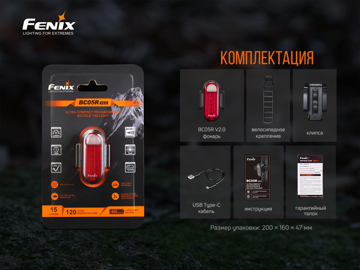 Модель ліхтаря Fenix BC05R V2. 0 є вдосконаленою версією велосипедної фари. Це надзвичайно компактна акумуляторна задня велофара з привабливим червоним світлом, зроблена для професіоналів і любителів їзди. Можна порівняти з попереднім велофонарем, ця модель знайшла більш яскраве освітлення – на 50% більше, збільшили і час роботи – на цілих 67%, а також виріс кут огляду – зі 120 до 180 градусів, на 50%.