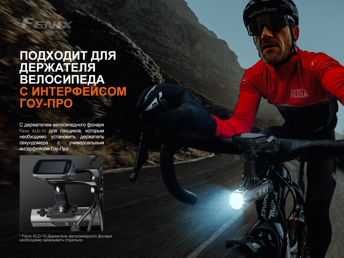 Можна застосовувати з тримачем велосипедного шолома та встановити на стандартний інтерфейс GoPro для безпечнішої їзди. Швидкознімне кріплення інноваційної конструкції та суцільнометалевий корпус для кращого розсіювання дозволяють цьому універсальному приладу впевнено висвітлювати ваші маршрути.