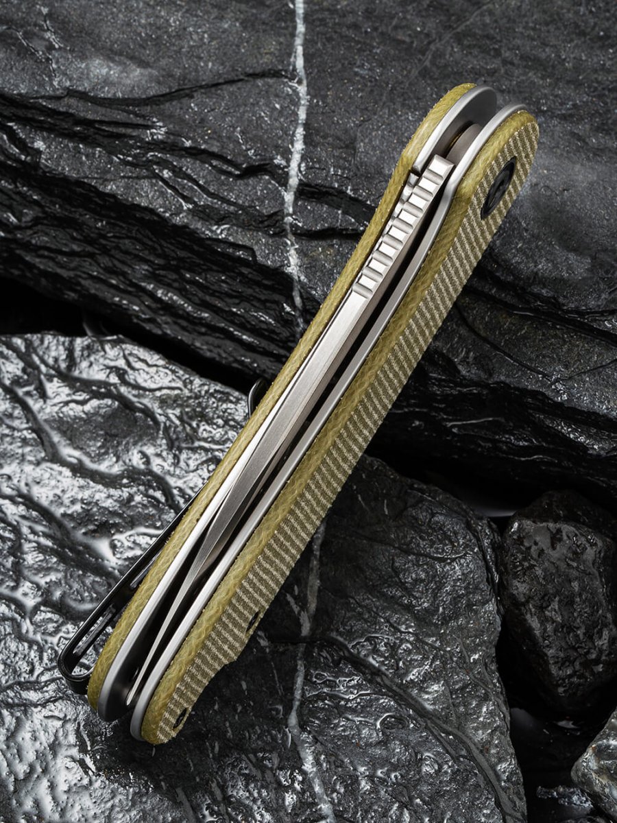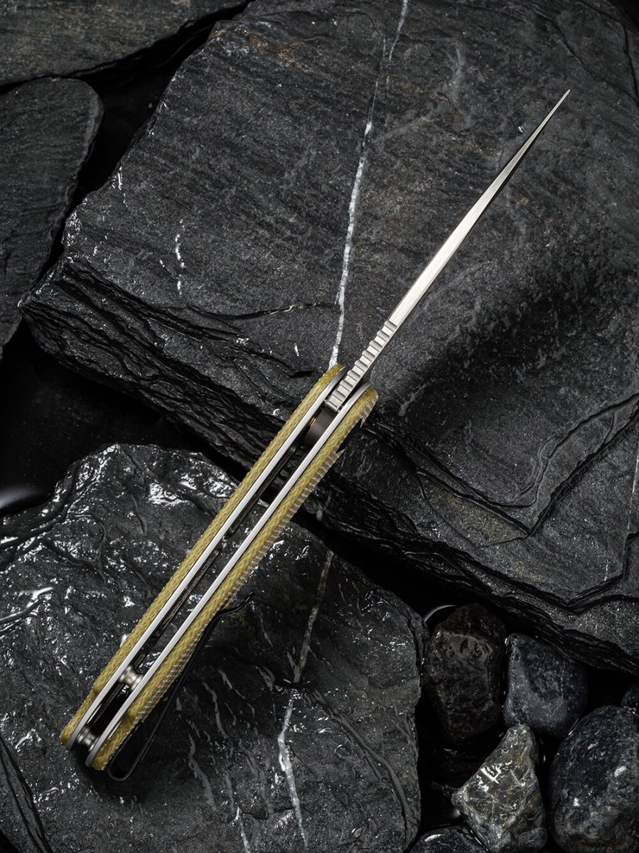 Рукоятка моделі виконана з мікарти. Це – композитний матеріал із льону та синтетичної смоли. Він виглядає чудово і гарантує достатнє зчеплення. Таким чином, керувати ножем дуже просто. Він стійкий до інтенсивних навантажень.