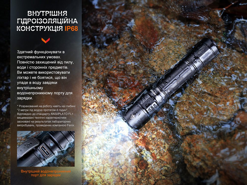 Вологозахист згідно стандарту IP68 забезпечує корпусу повну герметичність з можливістю використання не тільки під час інтенсивних опадів, але й у разі занурення під воду на глибину до 2-х метрів. Щоб підтримувати захист від вологи та пилу на належному рівні, рекомендується регулярно доглядати за ліхтарем, включаючи ущільнювальне кільце. Якщо цей елемент став непридатним для використання, достатньо замінити його на новий, що включений в основний набір.