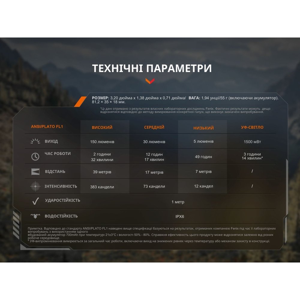 Ліхтар Fenix SW05R-UV, зарядний кабель USB-C, інструкція користувача, гарантійний талон.