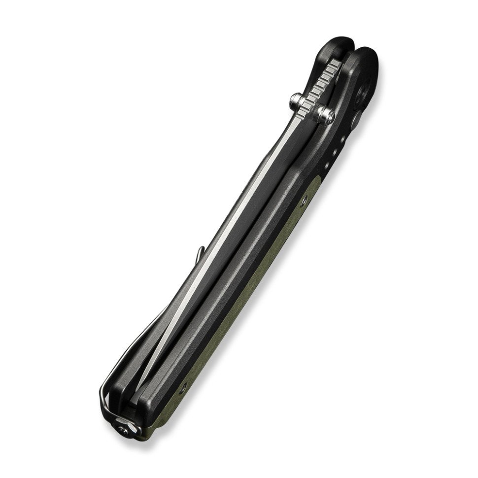 - Алюмінієве руківʼя зі вставками FRN. Алюміній знижує загальну вагу ножа до 104.7 г і відрізняється несприйнятливістю до окиснення та зношування. Вставки з нековзного термопластика FRN додають хвату надійності, особливо під час утримання вологою долонею або рукою в рукавичці.