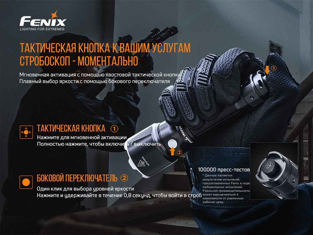 Ці дані по роботі моделі отримані в лабораторних умовах при температурі 21 +- 3 градуси Цельсія, а також вологості повітря 50-80 відсотків. Під час випробувань використовувалися літій-іонні батареї Fenix ARB-L21-5000 21700 і Fenix ARB-L18-3500.