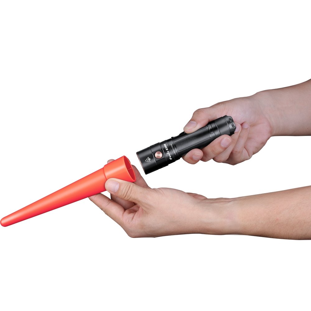 Сигнальний жезл AOT-S+ розроблений компанією Fenix для використання в екстрених ситуаціях, коли потрібно подати яскраві та помітні для інших людей світлові сигнали. Цей аксесуар фіксується на голові ліхтаря, трансформуючи спрямований промінь білого кольору в розсіяне світло червоного спектра, яке помітне на великій відстані навіть під час зливи або туману.