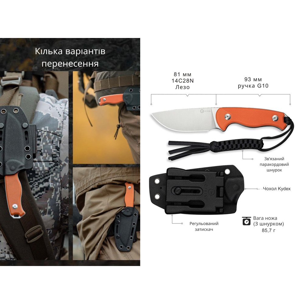 Фіксований ніж Civivi Timberbark створений для багатоцільового використання, починаючи з полювання, риболовлі, походів та закінчуючи повсякденними роботами на відкритому повітрі чи на виробництві.