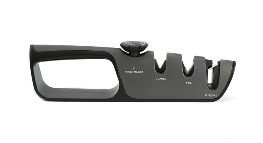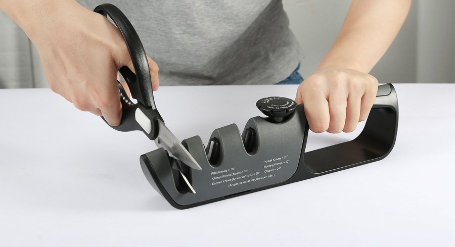 Настольное точило для ножей и ножниц. Угол заточки можно изменять при помощи специального барабанчика. Для удобства на одной из поверхностей точила указаны рекомендуемые углы для разных видов ножей.